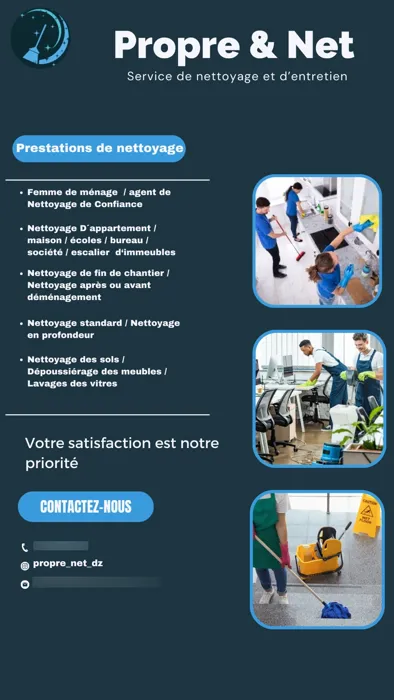 Notre société fournit des services Nettoyage à toutes les entreprises publiques et privées, salons, magasins de toutes sortes, ainsi qu'aux appartements et villas. Nous intervenons également sur l'aménagement d'espaces verts et le nettoyage de jardins. Nous fournissons également toutes sortes de matériels et d'équipements de nettoyage.
