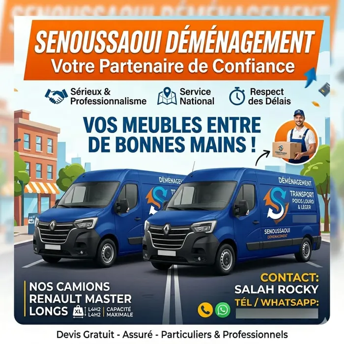 Le premier déménagement a été effectué ce jour 26 août 2025 et s'est très bien déroulé malgré le sixième étage. Bravo au professionnalisme de Amine (Chauffeur) et de son équipe. Merci Mr Senoussaoui Salah et au prochain déménagement.