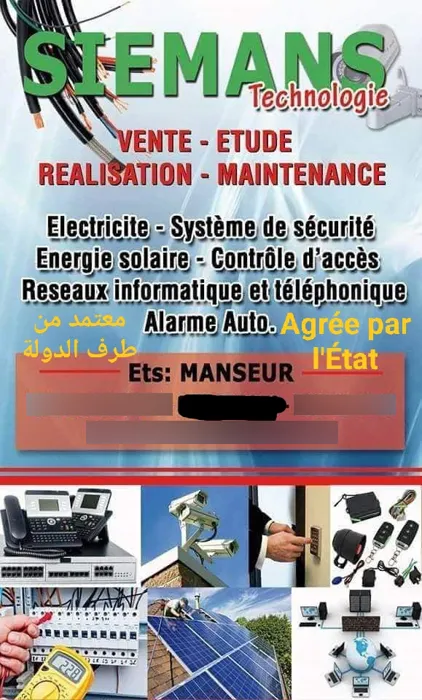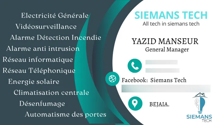 Siemans Tech béjaia offre une large gamme de services en électricité générale, système de sécurité, réseau informatique et télécoms, automatisme des portes, énergie renouvelable, climatisation générale, parabole tv
