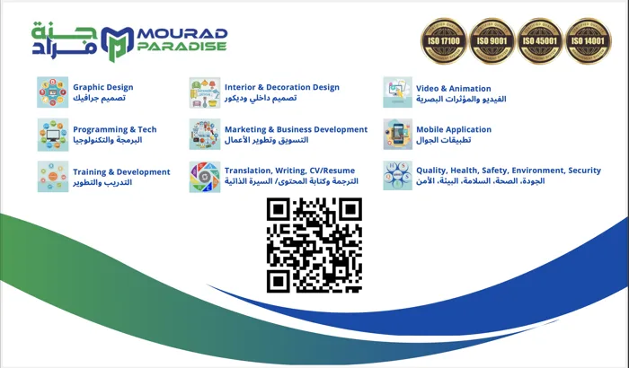 برامج وأدوات التصميم: مجموعة برامج أدوبي (إليستوري، إنديزاين، بريمير برو، أفتر إفكتس، فوتوشوب...) | ثري دي ماكس | سكتش أب | بلانر فايف دي | أوتوكاد | ريفيت Blender | Maya | Lumion | Microsoft Office (Word، PowerPoint، Excel، Outlook، Internet) والمزيد.