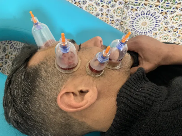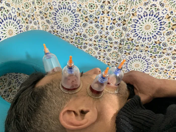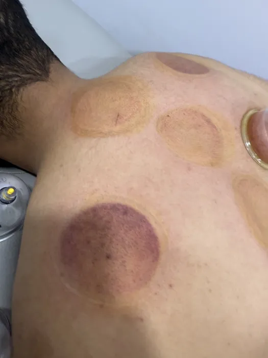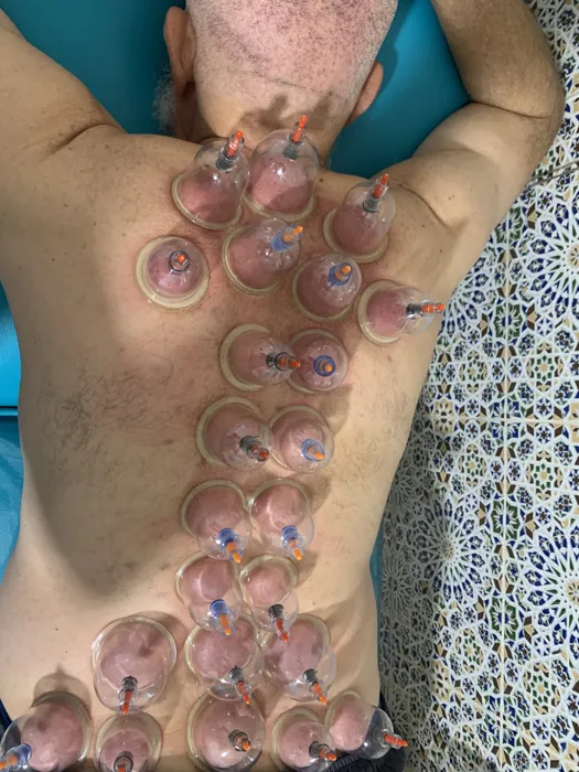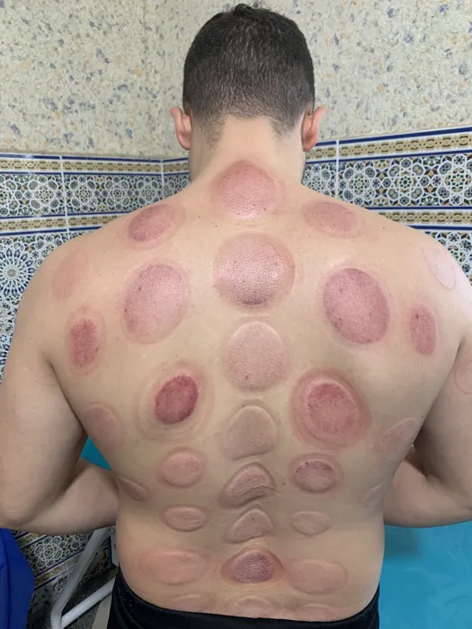 #تظهر حجامة رطبة بـ16 كأس موزعة بدقة من أعلى الكتفين وحتى منطقة أسفل الظهر، وتغطي مسارات مهمة جداً تتعلق بالجهاز الهضمي، الامتصاص، والدورة الدموية، بالإضافة إلى مناطق الآلام العضلية والعصبية.
