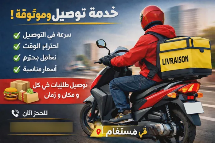 سلام عليكم. عامل توصيل بالدراجة النارية اعمل كل اسبوع من 9 صباحا الى 11:30 ليلا في ولاية مستغانم و بعض نواحيها لمهتم يتواصل معي.