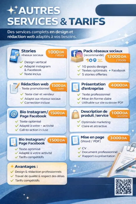 Avec plus de 5 ans d’expérience, j’accompagne entreprises, marques et indépendants en Algérie et à l’international dans la mise en place de solutions digitales performantes, modernes et rentables.
