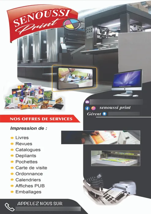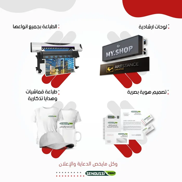 نحن مطبعة السنوسي الإشهارية و المتخصصة في مجال الدعاية والإعلان، نقدّم حلولًا متكاملة تبدأ من الفكرة والتصميم إلى الطباعة والتنفيذ. نوفّر خدمات التصميم الجرافيكي الاحترافي، وطباعة البطاقات بمختلف أنواعها، المطويات، الملصقات، اللافتات الإشهارية، البنرات، واللوحات بمقاسات متعددة وجودة عالية. كما نقوم بالطباعة على مختلف المواد والأشياء مثل الورق، القماش، البلاستيك، الفينيل، الهدايا الإشهارية، الأكواب، الأقمصة، الأكياس، والمنتجات المخصّصة حسب طلب الزبون. نحرص على الدقة في الألوان، جودة الخامات، احترام الآجال، وتقديم أسعار تنافسية تناسب الأفراد والمؤسسات. هدفنا هو إبراز هوية مشروعك بشكل احترافي وجذاب يترك أثرًا قويًا لدى عملائك.
